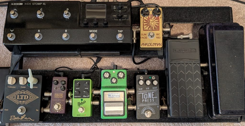 This board has been relatively static for the past few years, but I finally upgraded my Line 6 M9 and switched to the Helix HX Stomp XL. I wire the Helix using the 4-cable method and mostly use it for delays & reverb in the loop. It also makes a great back up if an amp were to ever fail and running direct is an option. I enjoy the various combinations of stacking the TS-9 or Bi-Comp in front of the LTD. There are a surprising number of combinations available. With clean amps I tend to leave the LTD on a lot.