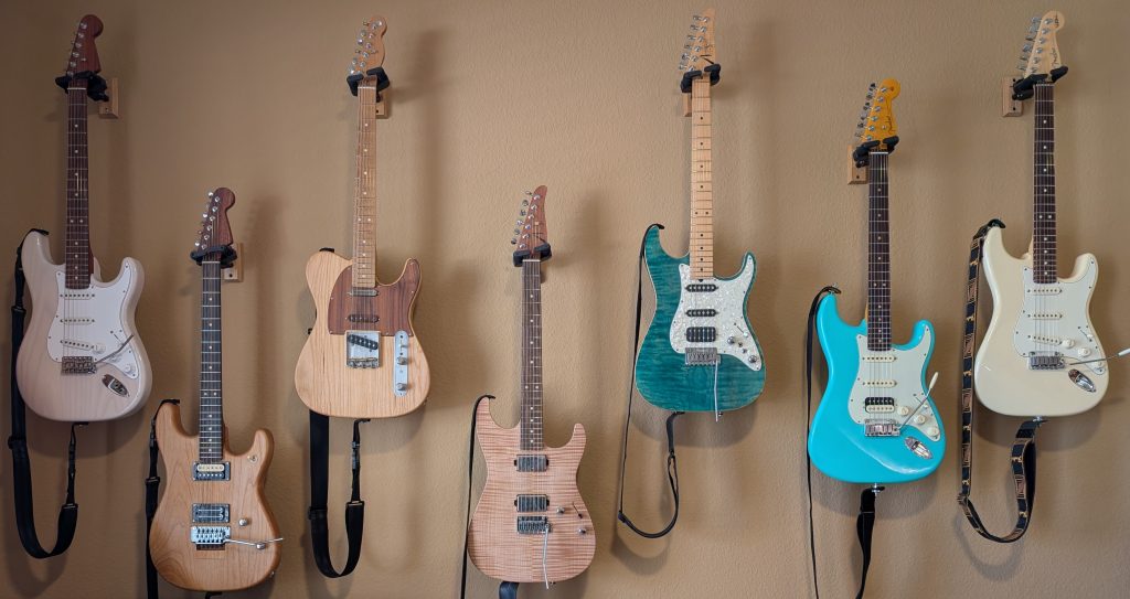 This has been my main guitar for over two decades and I estimate that I’ve played ~800 gigs with it. It has a fairly thick (.05 oversized) maple neck and a hollow alder body w/ maple top. The tone is fantastic and it doesn’t look bad either. In 2013, I replaced the pickups with Dimarzios (Air Classic Neck in the bridge and Area 58s in the middle and neck). While I love those pickups, I put the original Anderson ones back in ~2022 and replaced the H2+ with an HF2 in the bridge. If my house was on fire, this guitar is the one I would grab without hesitation. Fun fact: the serial number is my 21st birthday followed by the letter ‘B’ for Ben!